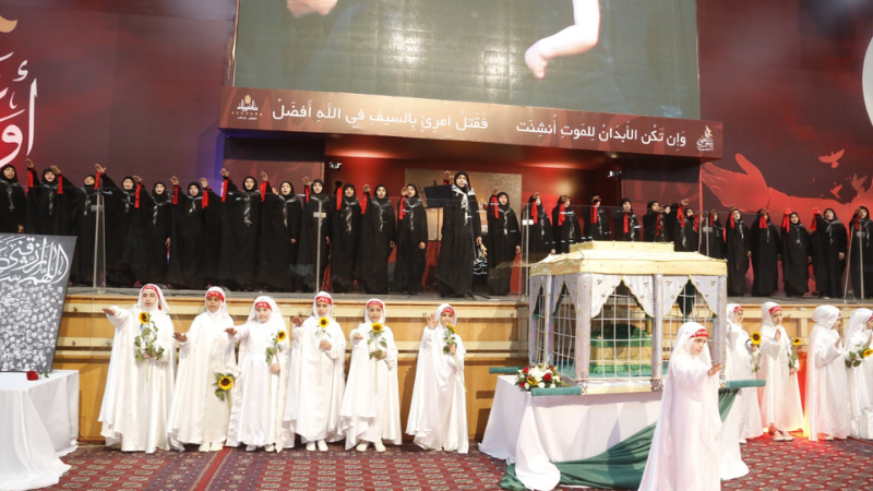 أطفال الشهداء حضروا في برنامج الحفل هذا العام، فكانت تلاوة عطرة لآيات من القرآن الكريم بصوت نجل الشهيد قاسم حاطوم، تبعتها فقرة إنشادية مع كورال "فدك" التابع للهيئات النسائية.