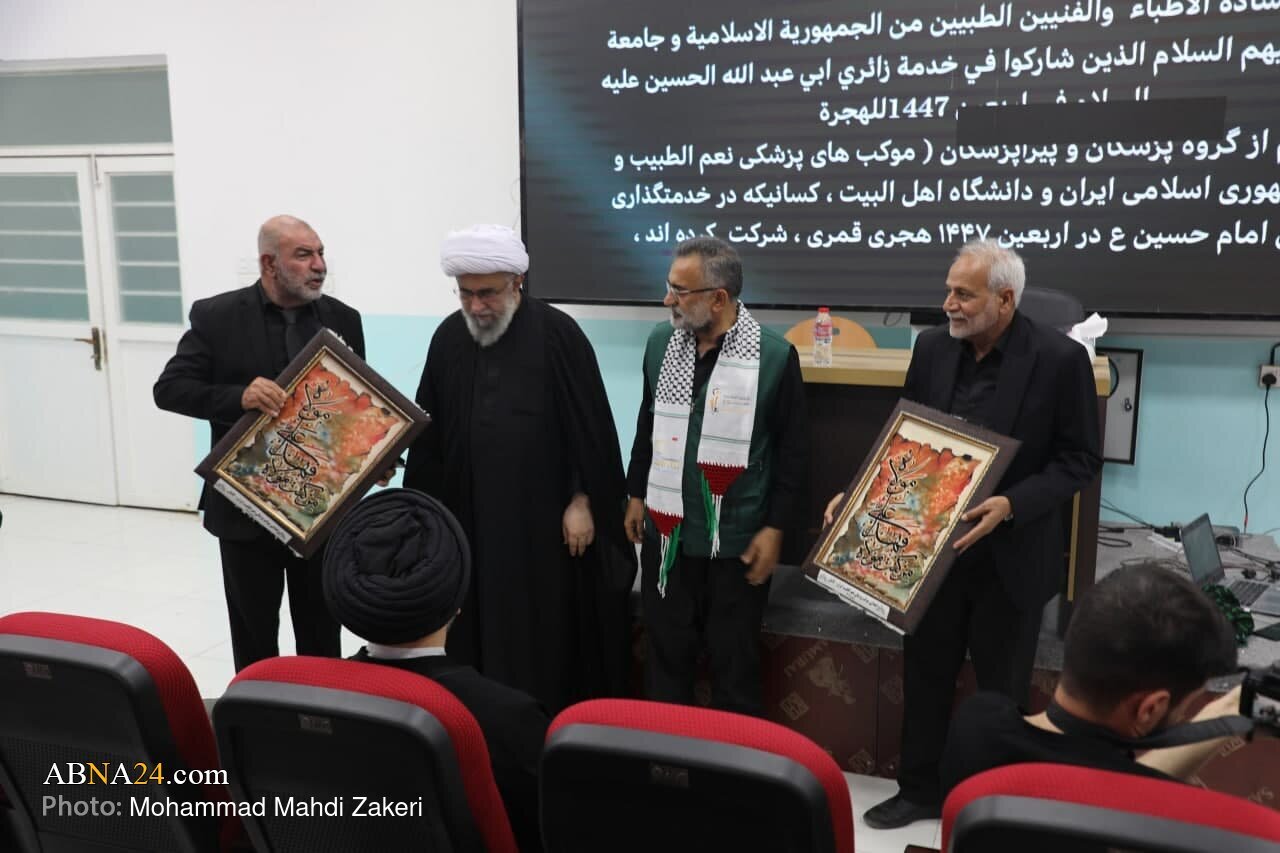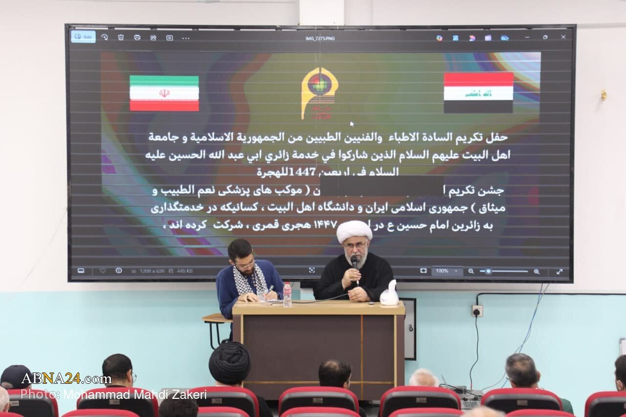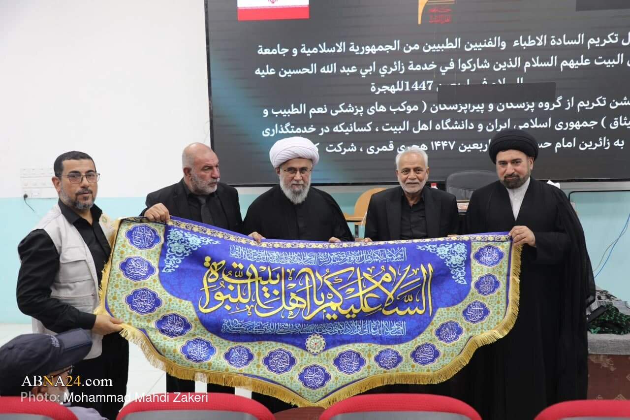 وفقا لما أفادته وكالة أنباء أهل البيت (ع) الدولية ــ أبنا ــ تمّ تكريم نخبة من الأطباء والكوادر الطبية الذين شاركوا في تقديم الخدمات الصحية لزوار الأربعين الحسيني، وذلك في جامعة أهل البيت (ع) الواقعة على طريق الحسين (ع) بين النجف الأشرف وكربلاء المقدّسة. وجرى هذا التكريم مع حضور سماحة آية الله رضا رمضاني، الأمين العام للمجمع العالمي لأهل البيت (ع)، الذي عبّر عن بالغ شكره وامتنانه للجهود الإنسانية النبيلة التي يبذلها هؤلاء في سبيل خدمة زوّار الإمام أبي عبد الله الحسين (ع)، مؤكداً على القيمة الروحية والإنسانية لهذا العمل المبارك في مسير العشق الحسيني.